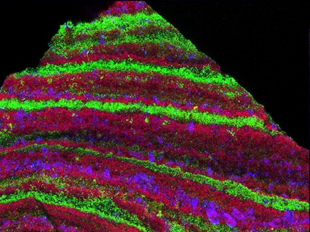 Els càlculs renals són acumulacions de sals insolubles que es formen al renyó, com sediments en una platja, quan no hi ha prou corrent per expulsar-los del cos. Poden resultar extremadament dolorosos quan finalment s’expulsen amb l’orina. De vegades, els pacients patixen infeccions inexplicables durant el tractament, i ací els investigadors n’exploren el motiu. Descobrixen que el tipus més comú de càlcul renal, format per oxalat de calci, pot contindre bacteris vius. En una secció transversal captada amb un microscopi d’alta potència, es poden veure biofilms bacterians vius (ressaltats en verd) entre les capes de substàncies químiques sedimentàries (en roig i blau). Estudis addicionals mostren que els bacteris que prosperen en l’entorn ric en orina del renyó poden ajudar a agrupar les sals (una raó més per mantindre’s ben hidratat).