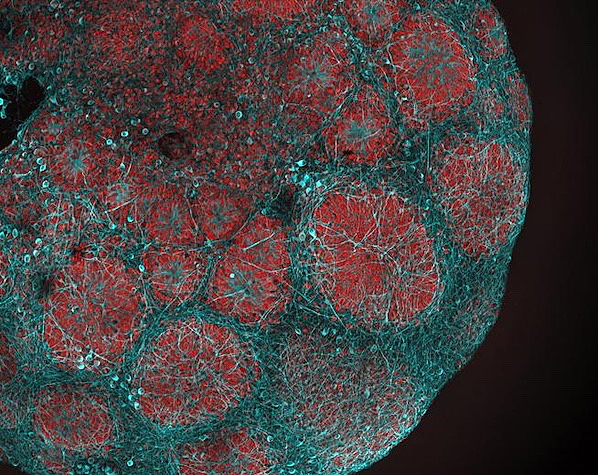 Els organoides de cervell com el de la imatge (amb progenitors neuronals en roig i neurones en cian) han sigut emprats per a fer proves a una selecció de medicaments per trobar candidats per al tractament d'una malaltia mitocondrial infantil rara, i sovint mortal, anomenada síndrome de Leigh (caracteritzada per una producció d'energia defectuosa, brots epilèptics, impediments mentals, debilitat muscular i paràlisi). Sorprenentment, les proves han demostrat que el sildenafil, més conegut pel seu nom comercial Viagra, és capaç de millorar el creixement i funció elèctrica dels nervis neuronals en organoides. El medicament, també ha allargat el temps de vida de ratolins model amb la síndrome de Leigh. Segons aquests resultats i la seguretat coneguda del medicament, se li va donar a un nombre reduït de pacients amb la síndrome de Leigh en els quals els símptomes milloraren. El motiu de l'èxit inconcebible del sildenafil podria vindre de l'activació que provoca en molècules senyalitzadores multifuncionals. Siga com siga, el potencial del medicament per tractar malalties tan devastadores en infants són bones notícies.