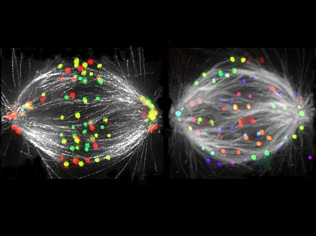 Quan les cèl·lules es preparen per dividir-se, cada “cèl·lula filla” ha de rebre una còpia dels plànols per a la vida cel·lular (l’ADN que permet que les noves cèl·lules es desenvolupen de la mateixa manera). Tot i que dividir una cèl·lula en dues ja és prou complex, ací els investigadors se centren en els mecanismes delicats que separen i repartixen els elements d’ADN anomenats cromosomes. Durant la metafase, unes estructures anomenades cinetocors, situades al centre dels cromosomes (ací destacats amb colors de l’arc de Sant Martí), solen alinear-se al mig de la cèl·lula, arrossegades fins allí pels microtúbuls (els fils grisos difusos de la imatge) en un procés anomenat congressió. Quan s’elimina CENP-E, una proteïna essencial perquè els cinetocors s’adherisquen als extrems dels microtúbuls, alguns cromosomes queden atrapats als “pols” externs de la cèl·lula (a l'esquerra). En restituir la proteïna, més cromosomes tornen a moure’s (a la dreta), cosa que suggerix un mecanisme que podria aprofitar-se per interrompre la divisió de cèl·lules canceroses.