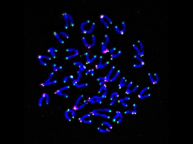 Aquests garbuixos blaus són els cromosomes d’una cèl·lula immunitària de ratolí (concretament, un limfòcit T) i els telòmers (les seqüències repetitives d’ADN als extrems dels cromosomes) estan ressaltats en verd. Els telòmers són un bon indicador de la salut cel·lular: la seua degradació i pèrdua indiquen un deteriorament de la funció de la cèl·lula. Les espècies reactives d’oxigen (abreviat com a ROS), que danyen l’ADN, poden provocar aquesta degradació dels telòmers i, malauradament, això és exactament el que passa als limfòcits T dins d’un tumor, on abunden estímuls estressants que induïxen ROS, com ara la baixa concentració d’oxigen o una elevada acidesa. Com que els limfòcits T poden reconèixer i destruir cèl·lules canceroses, mantindre la funció és essencial. El més important és que els investigadors han demostrat que, si s’administra un antioxidant dirigit específicament als telòmers dels limfòcits T, es pot evitar la seua disfunció. A més, quan aquests limfòcits T amb els telòmers protegits, es van infondre en ratolins amb melanoma, els tumors dels animals van ser més menuts que els dels ratolins de control i la seua supervivència va millorar.