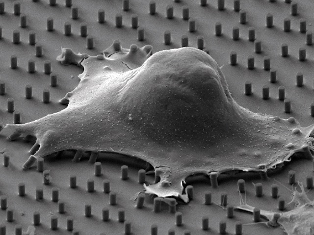 Cada dia perds pell. En un mes, tota la teua pell s’ha regenerat. Això és gràcies a les cèl·lules mare que viuen a la base de la teua epidermis i ascendixen a través de les capes de cèl·lules cutànies fins arribar a la superfície, transformant-se pel camí en cèl·lules madures de la pell. Durant aquest procés, el seu volum cel·lular augmenta. Utilitzant substrats dissenyats al laboratori, els investigadors van estudiar si els canvis de mida són els que determinen el seu destí. Prèviament, s’havia observat que els queratinòcits (el principal tipus cel·lular de l’epidermis) maduren quan es cultiven sobre una superfície amb pilars circulars minúsculs (mostrats ací mitjançant microscòpia electrònica de rastreig), però no sobre formes triangulars més grans (que, casualment, provocaven una reducció del volum). Ara, fent servir diferents fluids per modificar el volum cel·lular, s’ha vist clarament que reduir el volum impedix la maduració sobre superfícies amb pilars circulars, mentre que augmentar-lo l’afavorix, fins i tot sobre pilars triangulars. Per tant, els canvis en el volum cel·lular són clau en el desenvolupament de les cèl·lules de la pell.