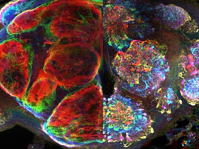 Dos jardiners es comuniquen constantment mentre poden una tanca per aconseguir la perfecció topiària. Un estudi ha identificat una parella de podadors moleculars que fan una feina semblant en el cervell en desenvolupament. Dos tipus de cèl·lules glials (cèl·lules del cervell que donen suport a les neurones) cooperen per a podar les connexions cerebrals en resposta a experiències particulars mentre el cablejat del cervell pren forma. Un tipus (glia embolcallant, mostrada a l’esquerra en el cervell de la mosca del vinagre juvenil) produïx serotonina, que envia un senyal al segon tipus (glia semblant als astròcits, a la dreta) perquè produïsca un enzim que remodela l’entorn al voltant de les neurones, permetent que les cèl·lules glials s’infiltren i poden a les unions (sinapsis) entre neurones. L’activació d’aquesta via va reactivar la plasticitat fins i tot en mosques més velles. Vies comparables són igualment importants en els humans, i una poda excessiva, insuficient o fora de l’objectiu està relacionada amb una sèrie d’afeccions mentals i neurològiques; per tant, comprendre com la serotonina glial controla aquest procés podria obrir una nova via d’entrada per estratègies terapèutiques.
