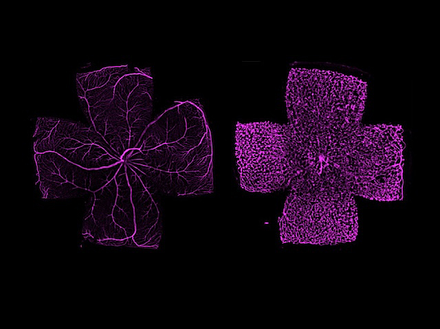 Les teues retines, els teixits sensibles a la llum que es troben en la part posterior dels ulls, es nodrixen d'una extensa xarxa de vasos sanguinis. Qualsevol interrupció d'este flux sanguini pot significar problemes per a la vostra visió. Els vasos sanguinis anormals són una característica de moltes malalties oculars. Modelar estos canvis vasculars és clau per a descobrir noves dianes terapèutiques. El TGF-β és una molècula de senyalització involucrada en el desenrotllament dels vasos sanguinis, i ací els investigadors han creat un model de ratolí sense TGF-β en els seus vasos de la retina. Destacant dels vasos sanguinis sota microscòpia de fluorescència va revelar la diferència entre les retines que manquen de TGF-β (a la foto, a la dreta) i les retines normals (a l'esquerra). Els defectes són característics dels quals ocorren en malalties de la retina, com els nous vasos sanguinis en forma de nusos anomenats flocs vasculars (a la dreta) que es troben en la retinopatia diabètica.