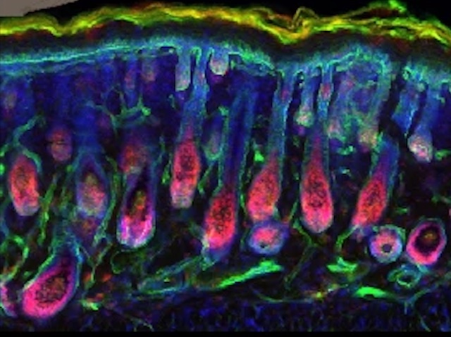 Per què alguns mamífers tenen pèl i altres, com nosaltres, no tant? Se sap que l’adquisició de característiques en el teixit cutani anomenades crestes epidèrmiques es correlaciona amb menys pèl, però la naturalesa de la relació no estava clara. Analitzant l’estructura, l’activitat gènica i les interaccions cel·lulars en la pell de moltes espècies de mamífers, des d’óssos grizzly fins a dofins (a la imatge es mostra una secció de pell de ratolí), aquest estudi revela que les crestes epidèrmiques es formen després del naixement en diverses espècies, a diferència dels fol·licles pilosos i les glàndules sudorípares, que es desenvolupen en l’embrió. A més, les mutacions gèniques que causen menys pèl no induïxen crestes epidèrmiques, ni a l’inrevés. Per tant, les crestes epidèrmiques no estan directament vinculades al desenvolupament del pèl. Aquests detalls podrien inspirar nous enfocaments per a la reparació de ferides i tractaments de malalties de la pell.