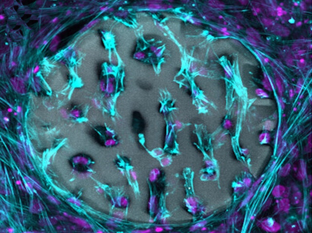 Flexibles, adhesives i adaptables, les cèl·lules són els blocs de construcció definitius: formen estructures al llarg de tota la vida durant el desenvolupament o s’adapten dins de ferides per reparar teixits. Per ajudar en este procés, els bioenginyers creen diminutes bastides que guien les cèl·lules mentre s’unixen. Però fer estes estructures biocompatibles (és a dir, que siguen favorables per a cèl·lules i teixits) és tot un repte. Ací, els investigadors utilitzen una tècnica anomenada polimerització de dos fotons, que consistix a dirigir impulsos làser molt precisos dins d’un hidrogel inestable. Les substàncies químiques reaccionen a cada flaix de llum i s’endurixen en patrons concrets, cosa que permet crear estructures com este model de fèmur (en gris). Troben un equilibri entre biocompatibilitat, perquè les estructures atraguen cèl·lules vives, i fotoreactivitat, que permet un disseny precís. La imatge de cèl·lules humanes (ressaltades en turquesa, amb nuclis en morat) cobrint el fèmur fa pensar en aplicacions futures per a tractar lesions.