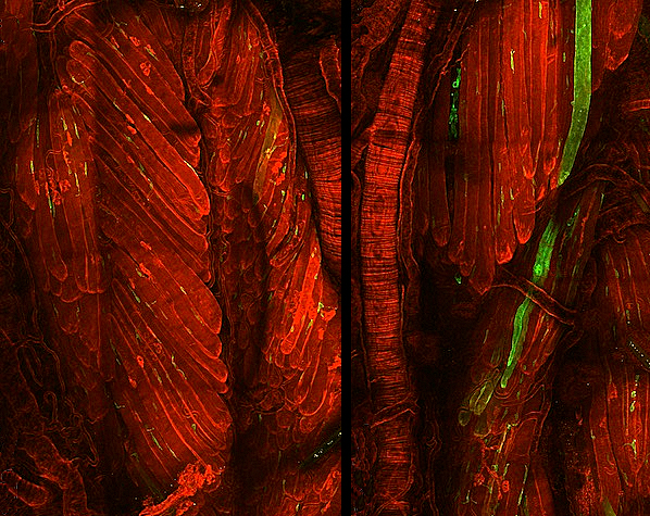 Les imatges en temps real obtingudes en un model murí de la distròfia muscular de Duchenne (DMD), un trastorn genètic que provoca la degeneració muscular (a la dreta; a l'esquerra, múscul normal de ratolí), revelen que la causa residix en les cèl·lules mare musculars, la capacitat de migració i proliferació de les quals un es veu afectada. Per tant, restaurar la funció de les cèl·lules mare podria regenerar el múscul en les persones que patixen DMD.