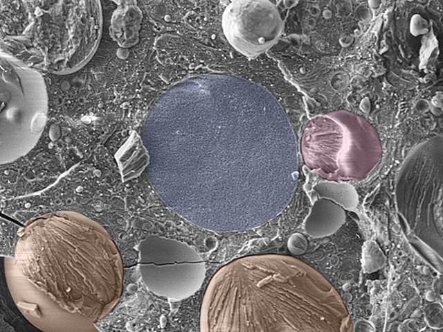 La malaltia del fetge gras no alcohòlic és un problema de salut global en augment, causat per una acumulació excessiva de greix al fetge, que compromet la funció de l’òrgan. En el camí cap a la fibrosi hepàtica en fase terminal, el fetge s’endurix, però fins ara no estava clar com l’acumulació de greix (lípids) es relaciona directament amb aquest enduriment. Ací, estudiant rates, els investigadors descobrixen que els cristalls lipídics induïts pel colesterol de la dieta endureixen directament el fetge com a pas previ a la fibrosi. En aquesta micrografia electrònica d’un fetge congelat, els cristalls lipídics que contenen colesterol es veuen en taronja i rosa. Llig l’article de la investigació publicat ací.