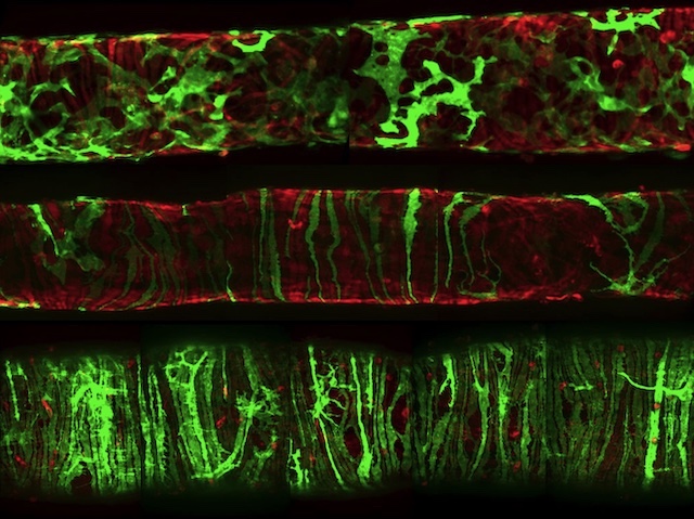 Per a mantindre els teixits en bon estat, tot allò que els pot danyar (des de cèl·lules malmeses fins a bacteris i virus) ha de ser eliminat. Ací és on entra en joc la limfa. Este fluid recull residus i agents nocius dels teixits i els transporta als ganglis limfàtics perquè siguen filtrats. La limfa circula pels vasos limfàtics col·lectors (VLc), que es contrauen per impulsar el líquid per tot el cos. Però d’on prové el ritme que coordina aquestes contraccions? Per identificar les anomenades cèl·lules «marcapassos» dels VLc, els investigadors van utilitzar enginyeria genètica per marcar amb fluorescència proteïnes indicatives de diferents tipus cel·lulars als VLc de ratolí (a la imatge). A continuació, se’n van analitzar la forma, l’expressió gènica i l’activitat elèctrica per identificar quines actuaven com a marcapassos. El resultat mostra que les cèl·lules musculars limfàtiques (en verd, a la part inferior), que recorren la paret dels vasos, en són les responsables.