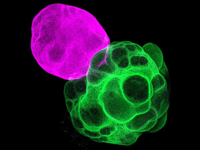 Els organoides són agregats diminuts i tridimensionals de teixit, cultivats al laboratori, que compartixen determinats tipus cel·lulars, estructures i funcions de l’òrgan que representen. En comparació amb les cèl·lules cultivades en una placa, els organoides oferixen als científics models superiors per a estudiar diversos processos de desenvolupament i de malalties. Ara, estos models ja de per si avançats s’han millorat encara més, i la imatge mostra un d’estos avanços. Dos tipus d’organoide (tàlem (de color rosa) i còrtex (de color verd)) es cultiven conjuntament com un assembloide cerebral, cosa que permet als investigadors estudiar com interactuen diferents parts de l’òrgan. S’ha comprovat que estos assembloides formen sinapsis entre les dos regions, amb el tàlem promovent activament la maduració dels circuits corticals (una maduració que no s’observava quan els organoides corticals es cultivaven a soles). Així, tant si s’estudia el cervell com qualsevol altre òrgan, la creació de cultius d’assembloides pot aportar un context fisiològic valuós que els organoides cultivats de manera individual poden no tindre.
